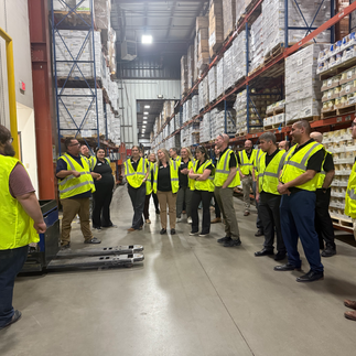 Our first stop was at Parker Hannifin, where we enjoyed muffins courtesy of Panera Bakery while hearing about the company’s history and participating in a brief safety meeting. We then split into three groups to tour their 1 million square foot facility, which specializes in filtration, employs around 1,100 people, and ships approximately 50,000 cases daily and over 13 million annually. One of the most notable takeaways was their commitment to community involvement. Parker Hannifin matches employee donations and has given over $500,000 back to the Kearney community.